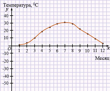 Сначала начертим в данной координатной плоскости график изменения температуры в Репетеке. Для этого на координатной плоскости нужно отметить точки с координатами (1; 1), (2; 4), (3; 10), (4; 18), (5; 24), (6; 29), (7; 31), (8; 29), (9; 22), (10; 15), (11; 8), (12; 3) и соединить эти точки последовательно плавной линией.
