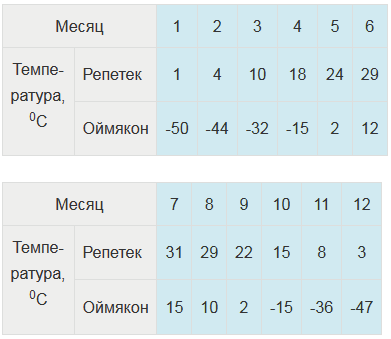 а) в каком месяце разница температур в Репетеке и Оймяконе наименьшая;