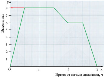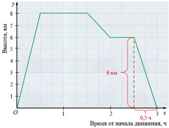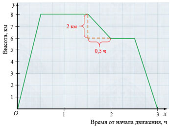 д) Самолет снижался 0,5 ч с высоты 8 км до высоты 6 км, то есть он пролетел 2 км, значит, скорость, с которой самолет снижался до высоты 6 км, равна: