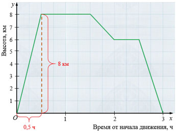 г) Самолет поднимался 0,5 ч с 0 до высоты 8 км, то есть он пролетел 8 км, значит, скорость, с которой самолет поднимался равна: