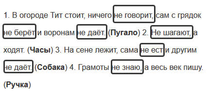 1. В огороде Тит стоит, ничего не говорит, сам с грядок не берёт и воронам не даёт. (....) 2. Не шагают, а ходят. (....) 3. На сене лежит, сама не ест и другим не даёт. (....) 4. Грамоты не знаю, а весь век пишу. (....)