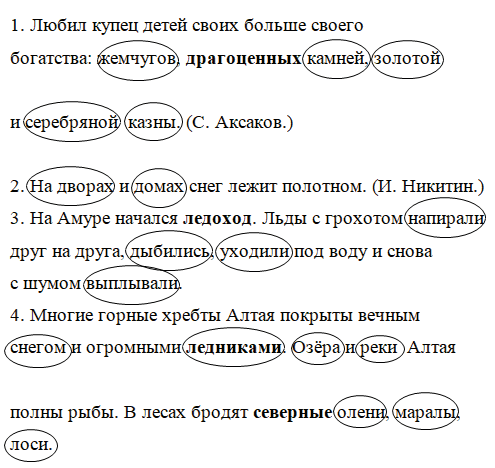 1. Любил купец детей своих больше своего богатства: жемчугов драгоценных камней золотой и серебряной казны. (С. Аксаков.) 2. На дворах и домах снег лежит полотном. (И. Никитин.) 3. На Амуре начался ледоход. Льды с грохотом напирали друг на друга дыбились уходили под воду и снова с шумом выплывали. 4. Многие горные хребты Алтая покрыты вечным снегом и огромными ледниками. Озёра и реки Алтая полны рыбы. В лесах бродят северные олени маралы лоси.