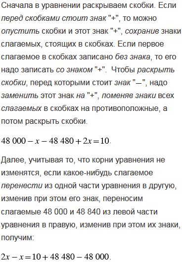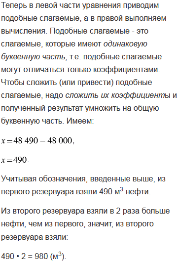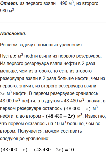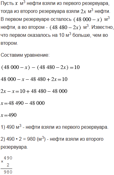 В одном резервуаре хранилось 48 000 м3 нефти, а в другом - 48 480 м3. После того как из первого резервуара взяли нефти в 2 раза меньше, чем из второго, в первом оказалось на 10 м3 больше, чем во втором. Сколько нефти взяли из каждого резервуара?