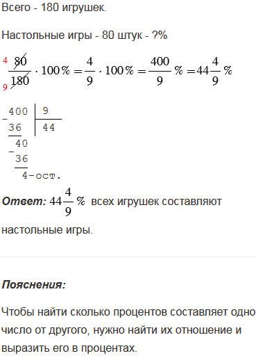 Для детского сада было закуплено 180 игрушек. Из них 80 - настольные игры. Какой процент всех игрушек составляют настольные игры?