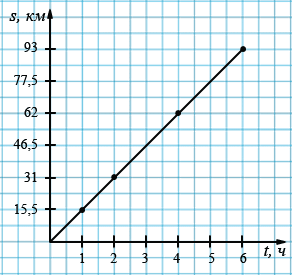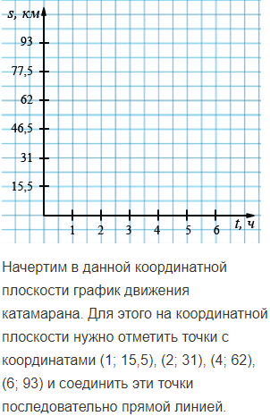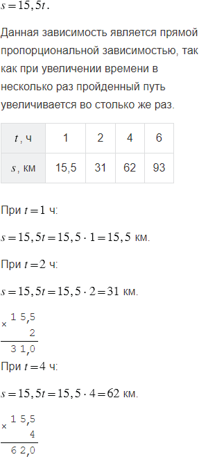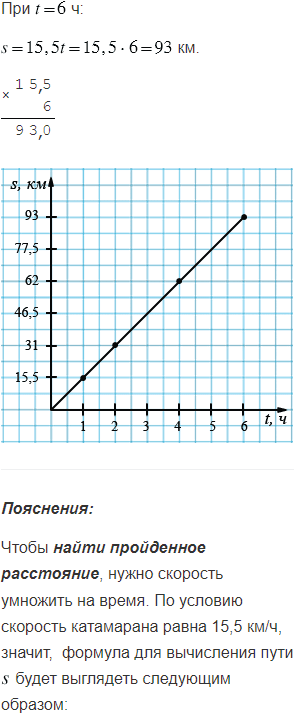 Катамаран двигался по озеру t ч со скоростью 15,5 км/ч. Запишите формулу для вычисления пути s. Является ли эта зависимость прямой или обратной пропорциональной зависимостью? Составьте таблицу значений s при t = 1 ч; t = 2 ч; t = 4 ч; t = 6 ч. Постройте график движения катамарана.