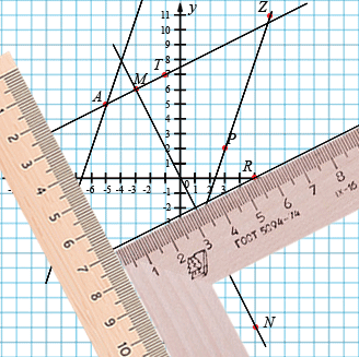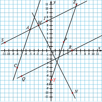 Отметьте точки M(-3; 6), N(5; -10), Q(-7; -6), R(5; 0), S(-11; 2), T(-1; 7), P(3; 2), Z(6; 11), A(-5; 5) и C(-8; -4) на координатной плоскости. Проведите прямые MN, QR, ST, PZ и AC. С помощью чертежного треугольника и линейки найдите прямые, параллельные и перпендикулярные друг другу. Определите по рисунку координаты точки пересечения прямой PZ с осью
