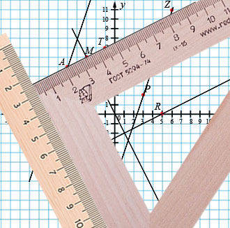 Далее, удерживая линейку, передвигаем треугольник до точки пересечения линейки и прямой ST.