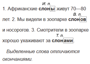 1. Африканские слоны живут 70—80 лет. 2. Мы видели в зоопарке слонов и носорогов. 3. Смотрители в зоопарке хорошо ухаживают за слонами.