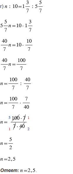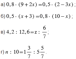 Уравнения из пунктов в) и г) представляют собой пропорции, поэтому при их решении используем основное свойство пропорции, согласно которому произведение крайних членов пропорции равно произведению ее средних членов. Затем, выполнив вычисления в правой части уравнения, находим неизвестный множитель.