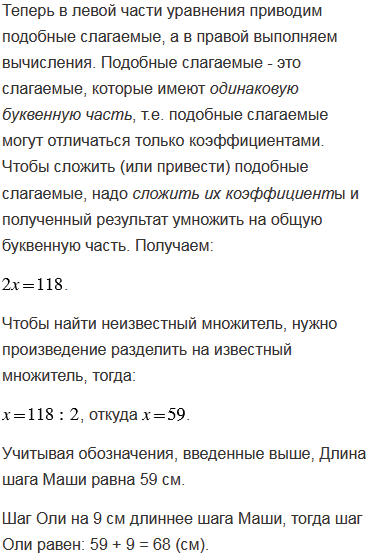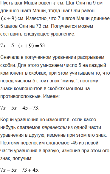 Семь шагов Маши длиннее пяти шагов Оли на 73 см. Шаг Оли на 9 см длиннее шага Маши. Чему равна длина шага каждой девочки?