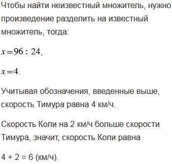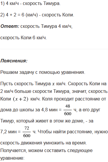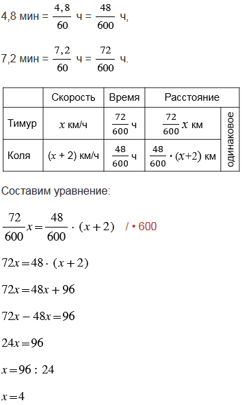 Коля проходит расстояние от дома до школы за 4,8 мин, а его друг Тимур, который живет в этом же доме, - за 7,2 мин. Найдите скорости мальчиков, если скорость Коли на 2 км/ч больше скорости Тимура.