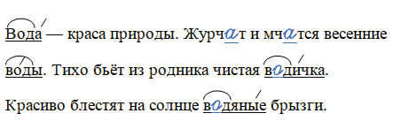 Вода — краса природы. Журч..т и мч..тся весенние воды. Тихо бьёт из родника чистая в..дичка. Красиво блестят на солнце в..дяные брызги.