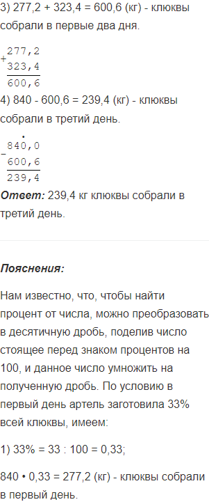 Артель заготовила 840 кг клюквы. В первый день она заготовила 33% всей клюквы, что составило