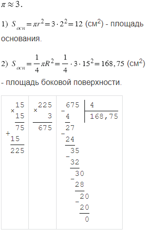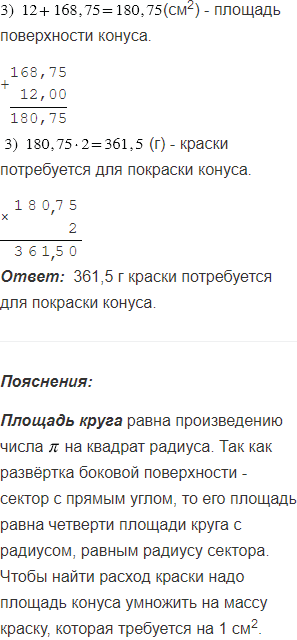 Сколько краски потребуется для покраски конуса, если радиус его основания 2 см, развёртка боковой поверхности - сектор с прямым углом, а радиус сектора равен 15 см? Расход краски на 1 см2 равен 2 г.