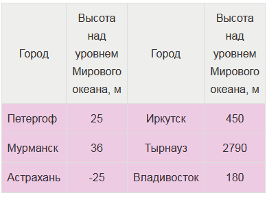 В таблице указана высота над уровнем Мирового океана некоторых городов. Перечислите эти города сначала в порядке убывания их высоты над уровнем Мирового океана, а затем в порядке возрастания.