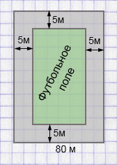 По периметру поля планируется сделать беговые дорожки шириной 5 м, значит, с каждой стороны поля ширина и длина площадки уменьшатся на 5 м. Тогда, учитывая то, что в центральной части площадки будет футбольное поле, его длина: