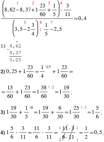 Обратите внимание, красные числа, стоящие сверху над действиями, указывают порядок действий, только не указано восьмое действие - это черта дроби (действие деления числителя на знаменатель).
