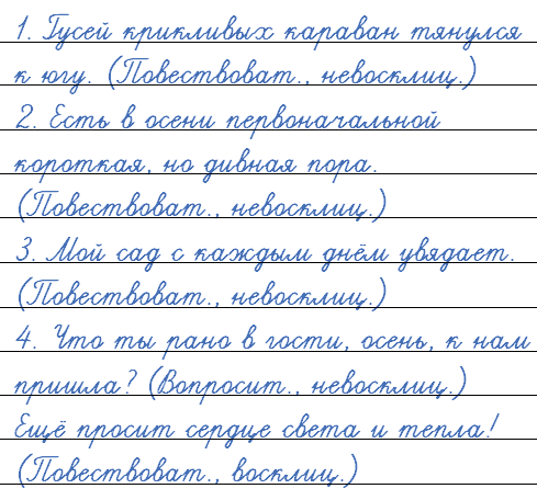 1. Гусей крикливых караван тянулся к югу. (повес., невоскл.) (А. Пушкин.) 2. Есть в осени перво-начальной короткая, но дивная лора. (повес., невоскл.) (Ф. Тютчев.) 3. Мой сад с каждым днём увядает. (повес., невоскл.) (А. Майков.) 4. Весь в пурпурном огне золотистый лес. (повес., невоскл.) (К‚ Бальмонт.)