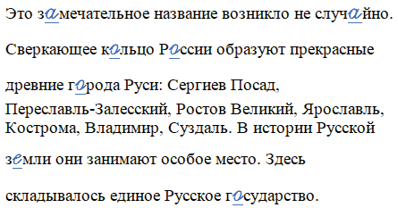 Это з_мечательное название возникло не случ_йно. Сверкающее к_льцо Р_ссии образуют прекрасные древние г_рода Руси: Сергиев Посад, Переславль-Залесский, Ростов Великий, Ярославль, Кострома, Владимир, Суздаль. В истории Русской з_мли они занимают особое место. Здесь складывалось единое Русское г_сударство.