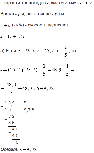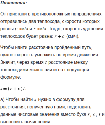 Составьте формулу для решения предыдущей задачи, если от пристани теплоходы отправились в противоположных направлениях. Найдите по полученной формуле: