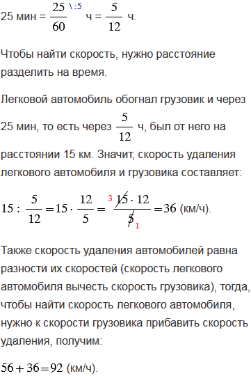 Легковой автомобиль обогнал грузовик и через 25 мин был от него на расстоянии 15 км. С какой скоростью двигался легковой автомобиль, если скорость грузовика составляла 56 км/ч?
