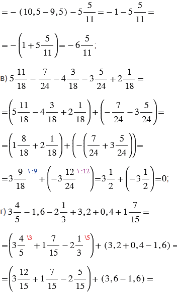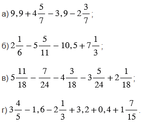 Используя переместительное и сочетательное свойства сложения, группируем отдельно десятичные дроби и отдельно обыкновенные дроби и смешанные числа, при этом обращая внимание на знаменатели дробей, и выполняем вычисления.
