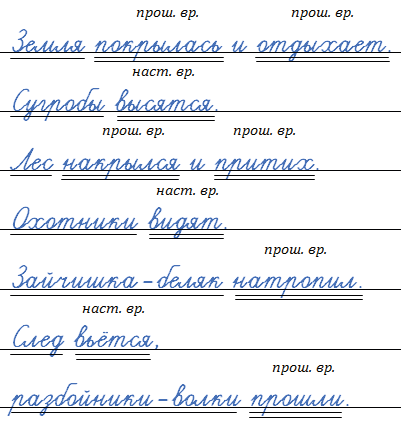 Найдите в каждом предложении подлежащее и сказуемое. Выпишите их по образцу. Укажите время глаголов-сказуемых.