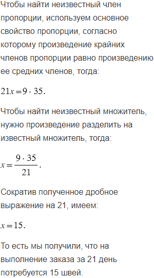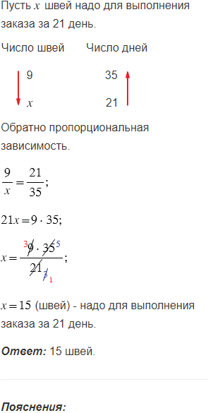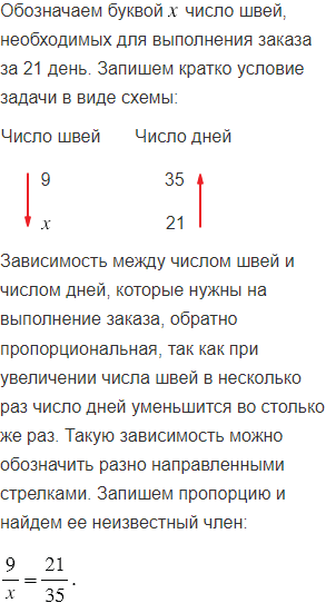 Сколько надо швей для выполнения заказа на пошив костюмов для школьного ансамбля за 21 день, если 9 швей могут выполнить этот заказ за 35 дней?