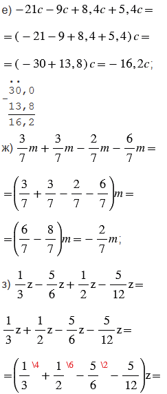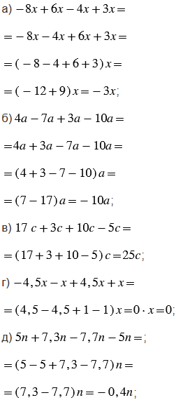 Слагаемые, имеющие одинаковую буквенную часть, называют подобными слагаемыми. Чтобы сложить подобные слагаемые, надо сложить их коэффициенты (числа, стоящие перед буквенной частью) и полученный результат умножить на общую буквенную часть.