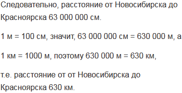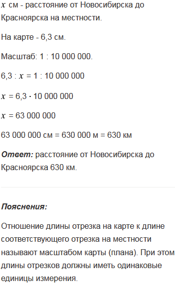 Масштаб карты 1 : 10 000 000. Чему равно расстояние от Новосибирска до Красноярска, если на карте оно равно 6,3 см?