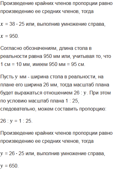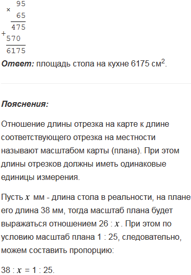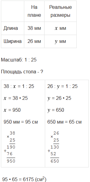 Стол на плане кухни, выполненном в масштабе 1 : 25, имеет форму прямоугольника со сторонами 38 мм и 26 мм. Найдите, какую площадь занимает стол на кухне в натуральную величину.