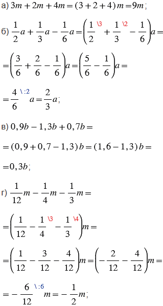 Слагаемые, имеющие одинаковую буквенную часть, называют подобными слагаемыми. Чтобы сложить подобные слагаемые, надо сложить их коэффициенты (числа, стоящие перед буквенной частью) и полученный результат умножить на общую буквенную часть.