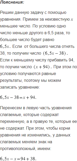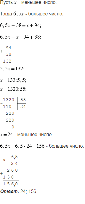Если от большего числа отнять 38, а к меньшему прибавить 94, то получатся равные результаты. Найдите эти числа, если одно число меньше другого в 6,5 раза.