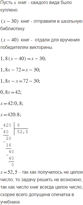 Было куплено одинаковое количество научно-познавательных и научно-фантастических книг. Часть научно-познавательных книг отправили в школьную библиотеку. В 1,8 раза меньшее число научно-фантастических книг отдали для вручения победителям викторины. После этого для подарков шестиклассникам научно-познавательных книг осталось 30, а научно-фантастических - 40 книг. Сколько книг было: а) куплено; б) отправлено в школьную библиотеку; в) отдано для вручения победителям викторины?