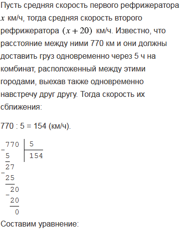 Два рефрижератора из двух городов, расстояние между которыми 770 км, должны доставить груз одновременно через 5 ч на комбинат, выехав также одновременно навстречу друг другу. Средняя скорость на трассе одного рефрижератора на 20 км/ч больше средней скорости другого. С какой средней скоростью они должны двигаться, чтобы прибыть в пункт назначения?