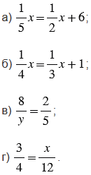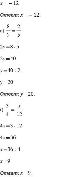 Уравнения из пунктов в) и г) представляют собой пропорции, поэтому при их решении используем основное свойство пропорции, согласно которому произведение крайних членов пропорции равно произведению ее средних членов. Затем находим неизвестный множитель.