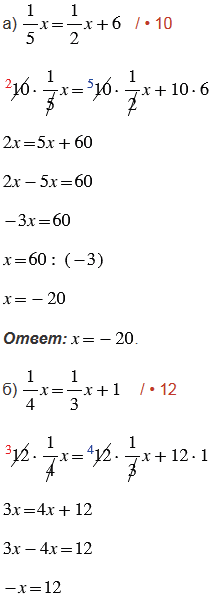 При решении уравнений из пунктов а) и б) сначала используем то, что корни уравнения не изменяются, если обе части уравнения умножить на одно и то же число, не равное нулю (умножаем левую и правую част уравнений на общий знаменатель всех дробей, входящих в это уравнение, чтобы избавиться от всех знаменателей при сокращении). Затем используем то, что если перенести слагаемое из одной части уравнения в другую с противоположным знаком, то полученное уравнение имеет те же корни, что и данное (собираем компоненты с переменной в левой части уравнения, а числа - в правой части уравнения). Далее далее в левой части уравнения приводим подобные слагаемые, а в правой - выполняем вычисления. Слагаемые, имеющие одинаковую буквенную часть, называют подобными слагаемыми. Чтобы сложить подобные слагаемые, надо сложить их коэффициенты (числа, стоящие перед буквенной частью) и полученный результат умножить на общую буквенную часть. И последним находим неизвестный множитель.