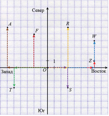 При записи координат точки, на первое место в скобках пишем то число, которое соответствует числу клеток (км) вдоль горизонтальной оси, а на второе место - то число, которое соответствует числу клеток (км) вдоль вертикальной оси. При этом, если идем на Север или на Восток, координаты будут положительными, а если идем на запад или на юг, координаты будут отрицательными.