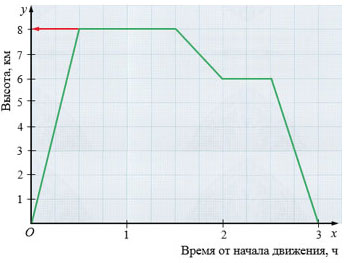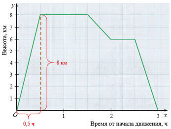 г) Самолет поднимался 0,5 ч с 0 до высоты 8 км, то есть он пролетел 8 км, значит, скорость, с которой самолет поднимался равна: