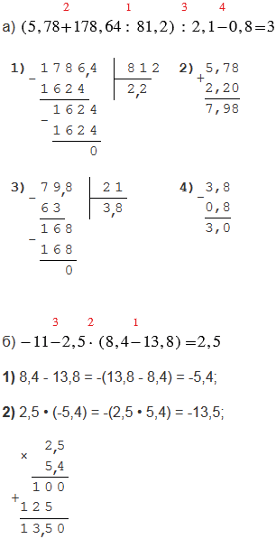 а) (5,78 + 178,64 : 81,2) : 2,1 - 0,8;
