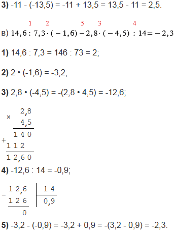 в) 14,6 : 7,3 • (-1,6) - 2,8 • (-4,5) : 14;