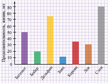 Постройте столбчатую диаграмму максимальной продолжительности жизни некоторых животных по следующим данным: бегемот 50 лет, бобёр - 20 лет, дельфин - 75 лет, заяц - 11 лет, корова - 35 лет, лев - 30 лет, слон - 80 лет.
