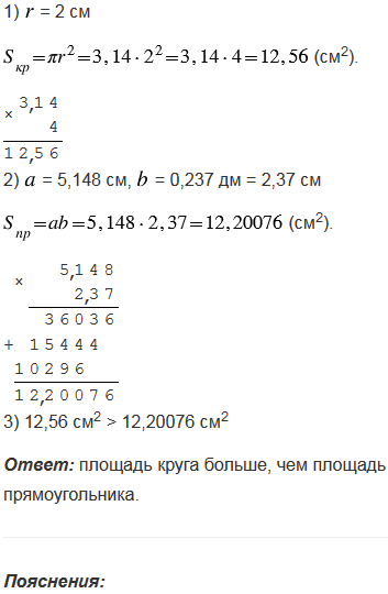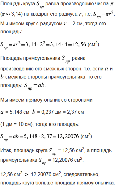 Сравните площадь круга, радиус которого 2 см, и площадь прямоугольника со сторонами 5,148 см и 0,237 дм.