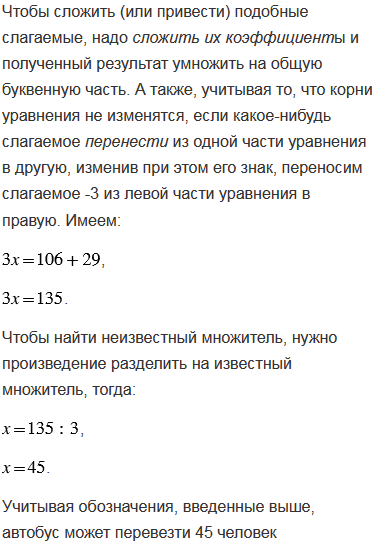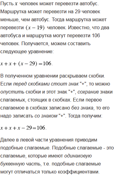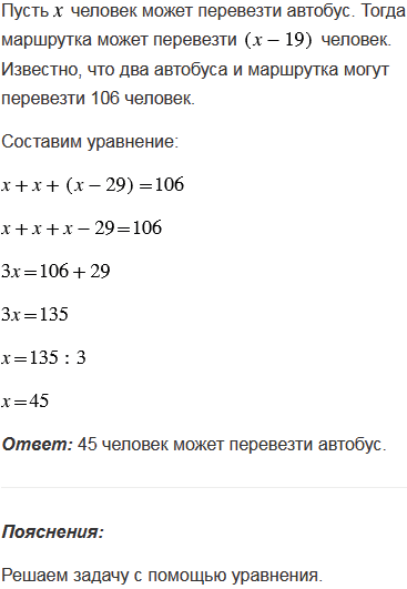 Два автобуса и маршрутка могут перевезти 106 человек. Маршрутка может перевезти на 29 человек меньше, чем автобус. Сколько человек может перевезти автобус?