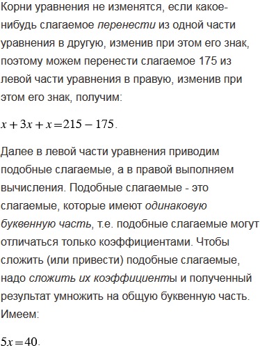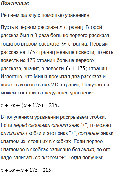 Миша прочитал два рассказа и повесть. Второй рассказ был в 3 раза больше первого рассказа, а первый рассказ - на 175 страниц меньше повести. Сколько страниц в каждом рассказе и повести, если Миша прочитал 215 страниц?