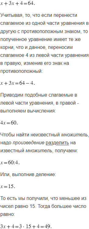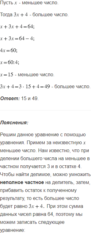 При делении большего числа на меньшее в частном получается 3 и в остатке 4. Найдите эти числа, если их сумма равна 64.