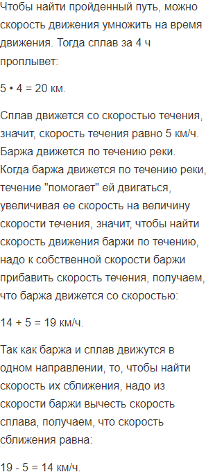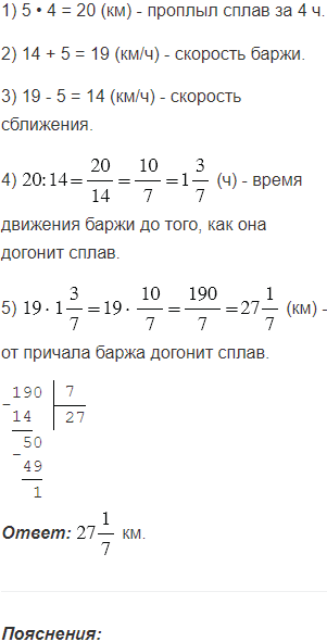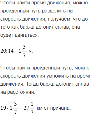 От причала осуществили сплав леса со скоростью 5 км/ч. Через 4 ч вслед за ним вышла баржа, собственная скорость которой равна 14 км/ч. На каком расстоянии от причала баржа догонит сплав?