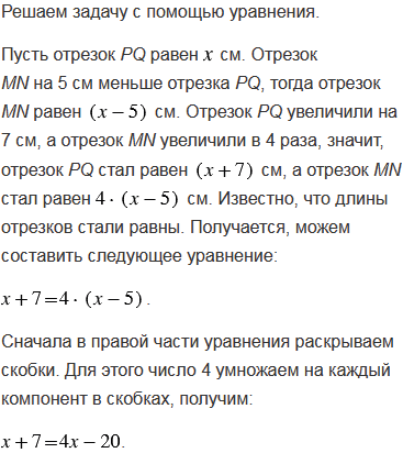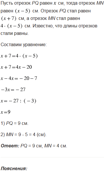 Отрезок MN на 5 см меньше отрезка РQ. Если отрезок РQ увеличить на 7 см, а отрезок МN увеличить в 4 раза, то их длины будут равны. Найдите длины отрезков.