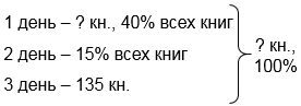 Все книги, которые напечатала типография за три дня составляют 100%. Типография в первый день напечатала 40% всех книг из заказа, во второй день - 15% всех книг, в третий день - остальные 135 книг. Значит, 135 книг, которые типография напечатала в третий день, составляют: