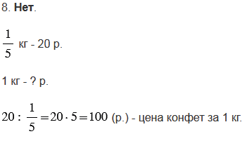 8. Если одна пятая килограмма конфет стоит двадцать рублей, значит, цена конфет четыре рубля за килограмм.